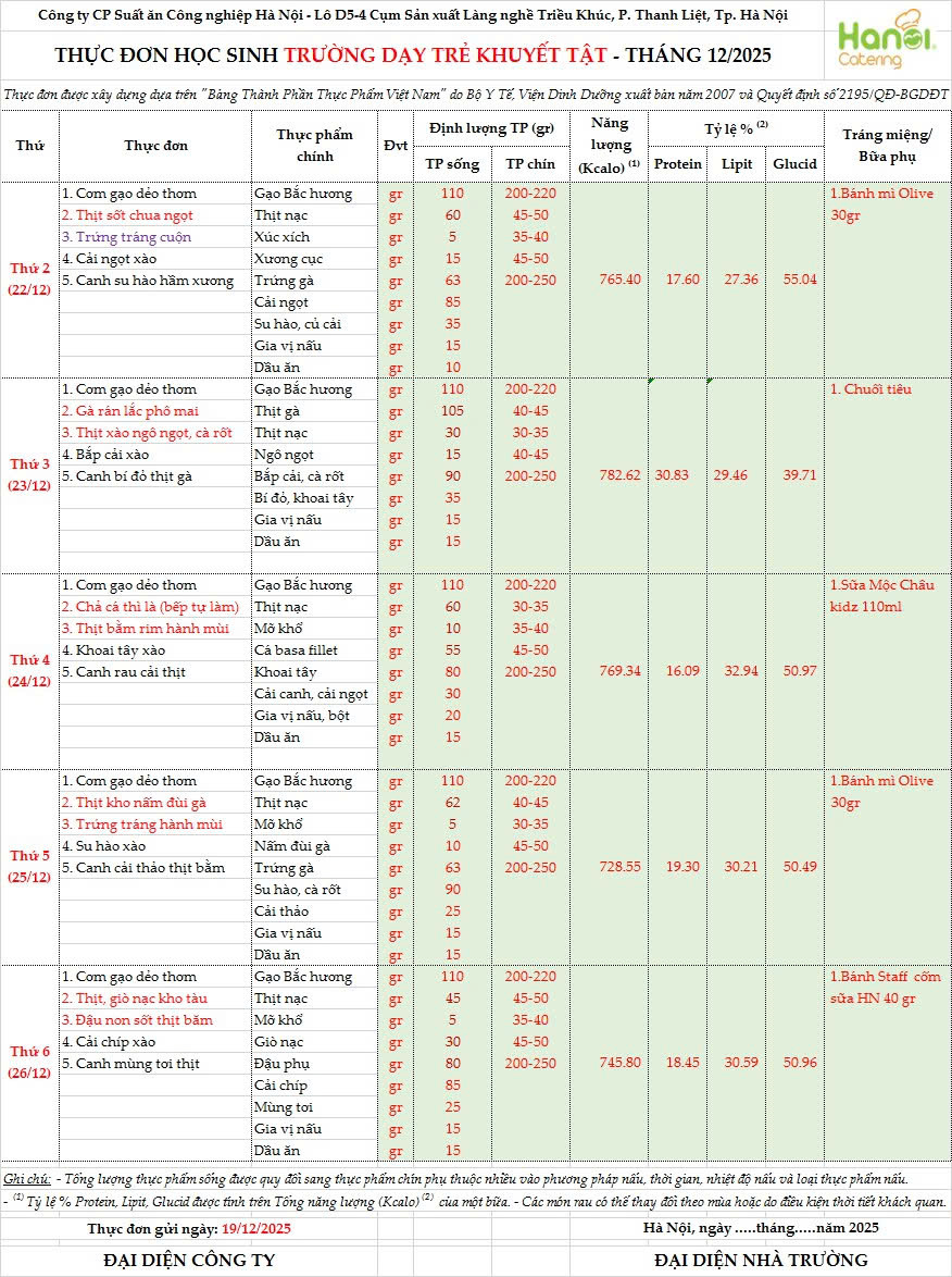 Thực đơn ăn bán trú tuần từ 22/12/2025 đến ngày 26/12/2025