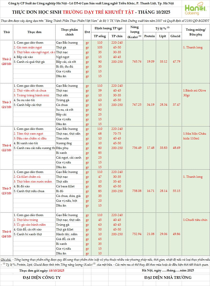 Thực đơn ăn bán trú tuần từ 20/10/2025 đến ngày 24/10/2025