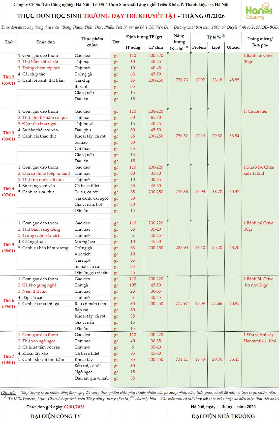 Thực đơn ăn bán trú tuần từ 05/01/2026 đến ngày 09/01/2026